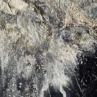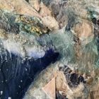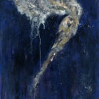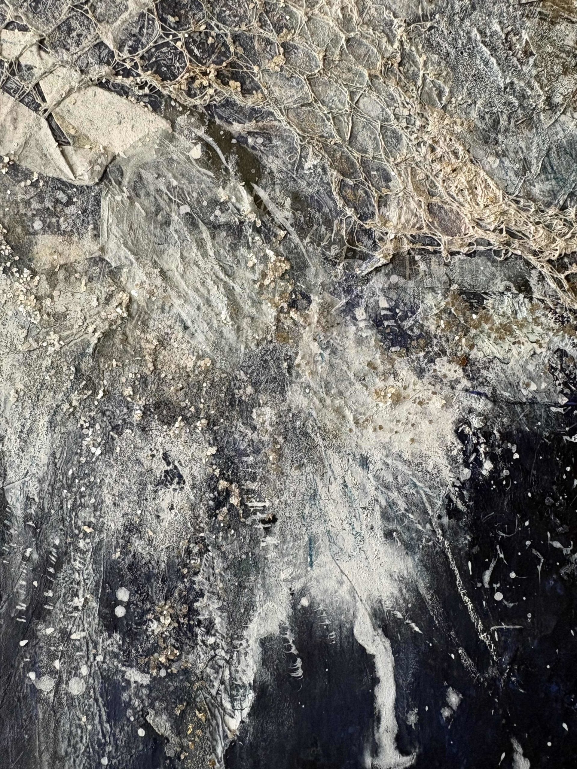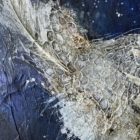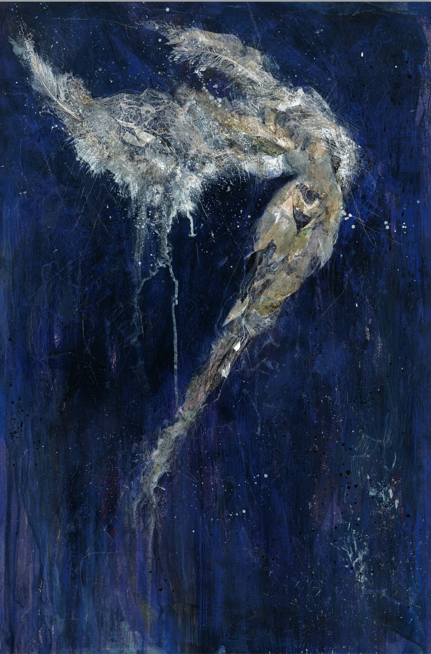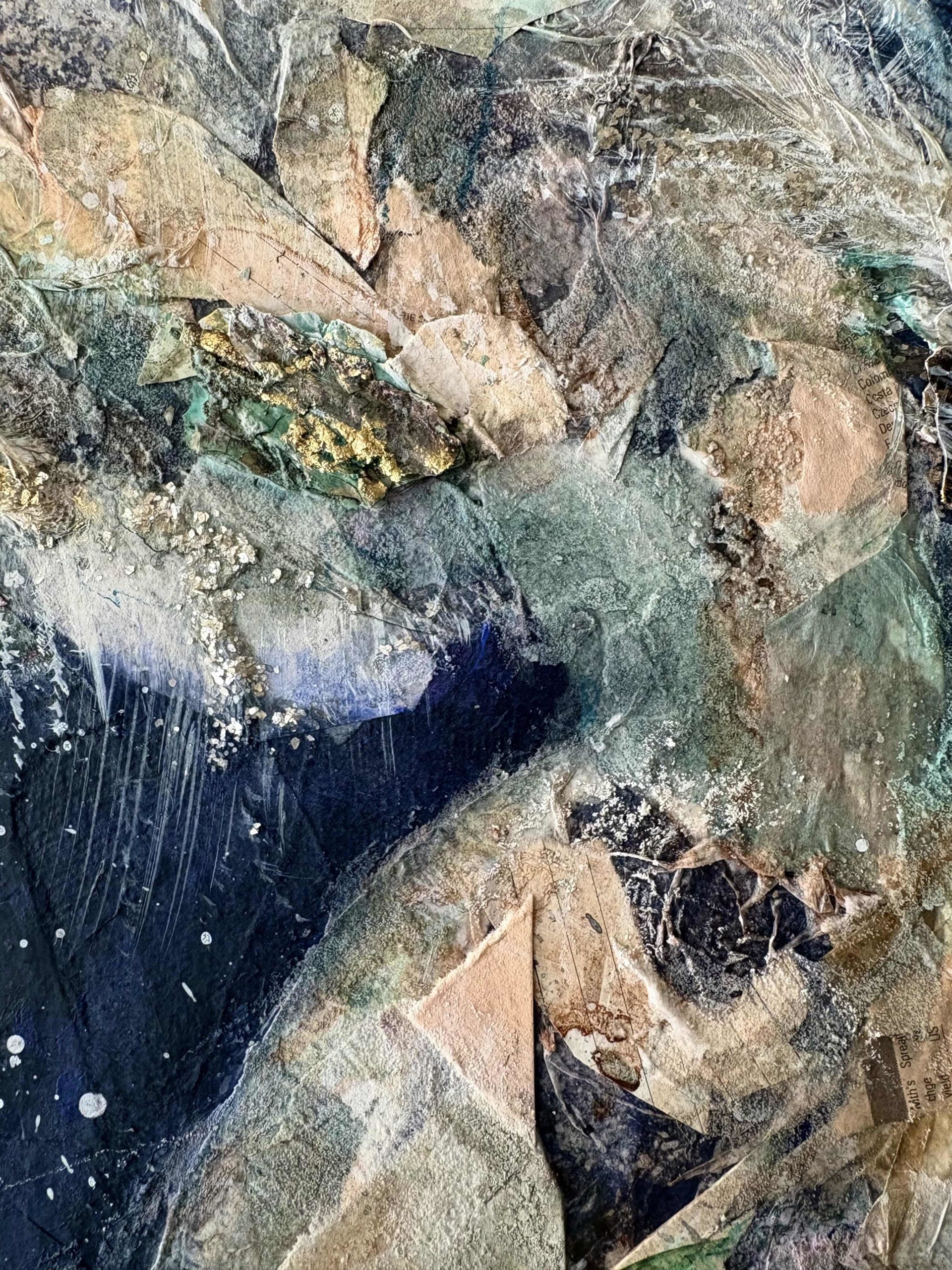 I’ve combined traditional media (acrylic, wax, pastels, ink) with elements found in the street and on the shoreline, including gull feathers, old paint chips and waste materials.