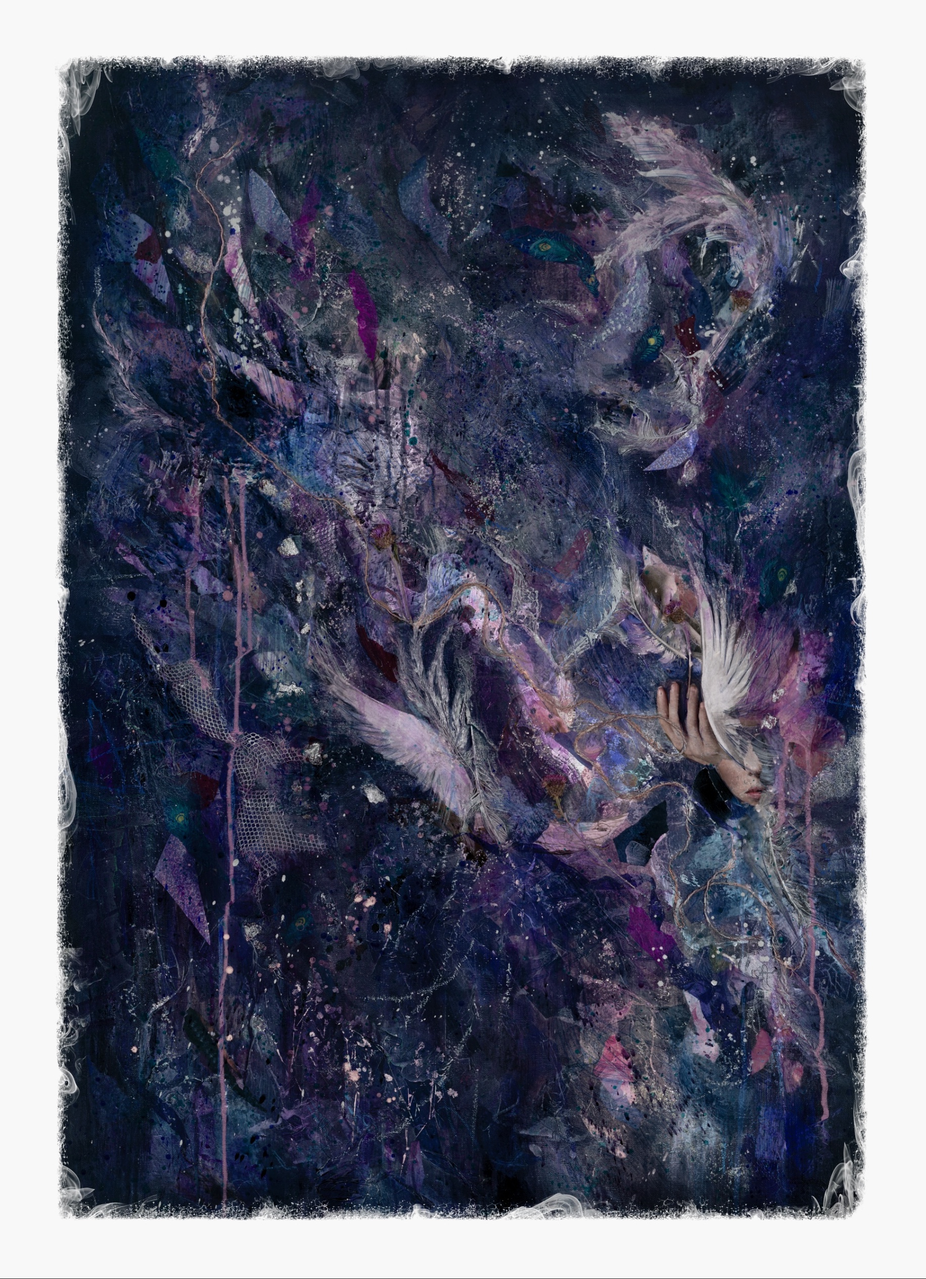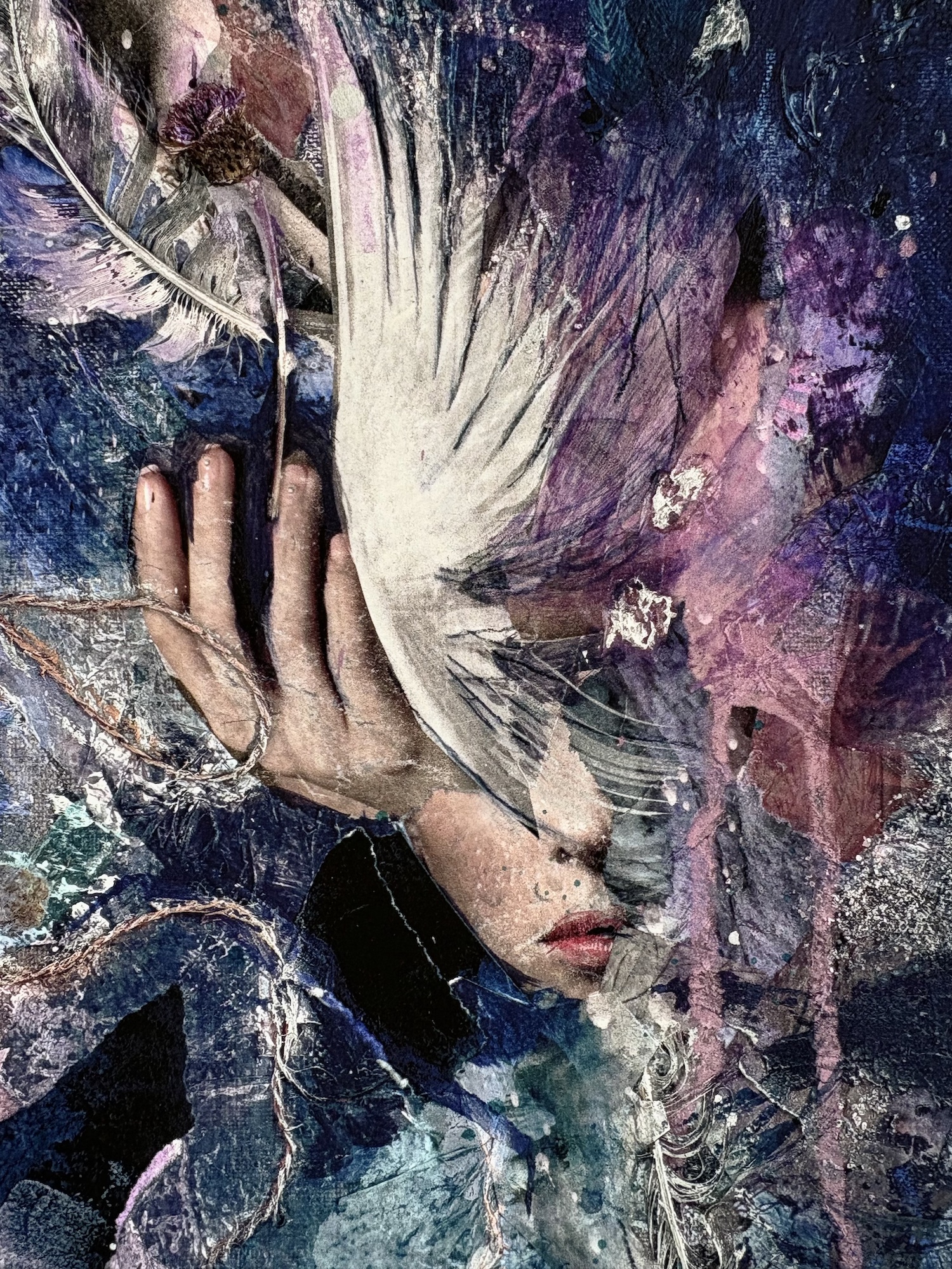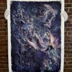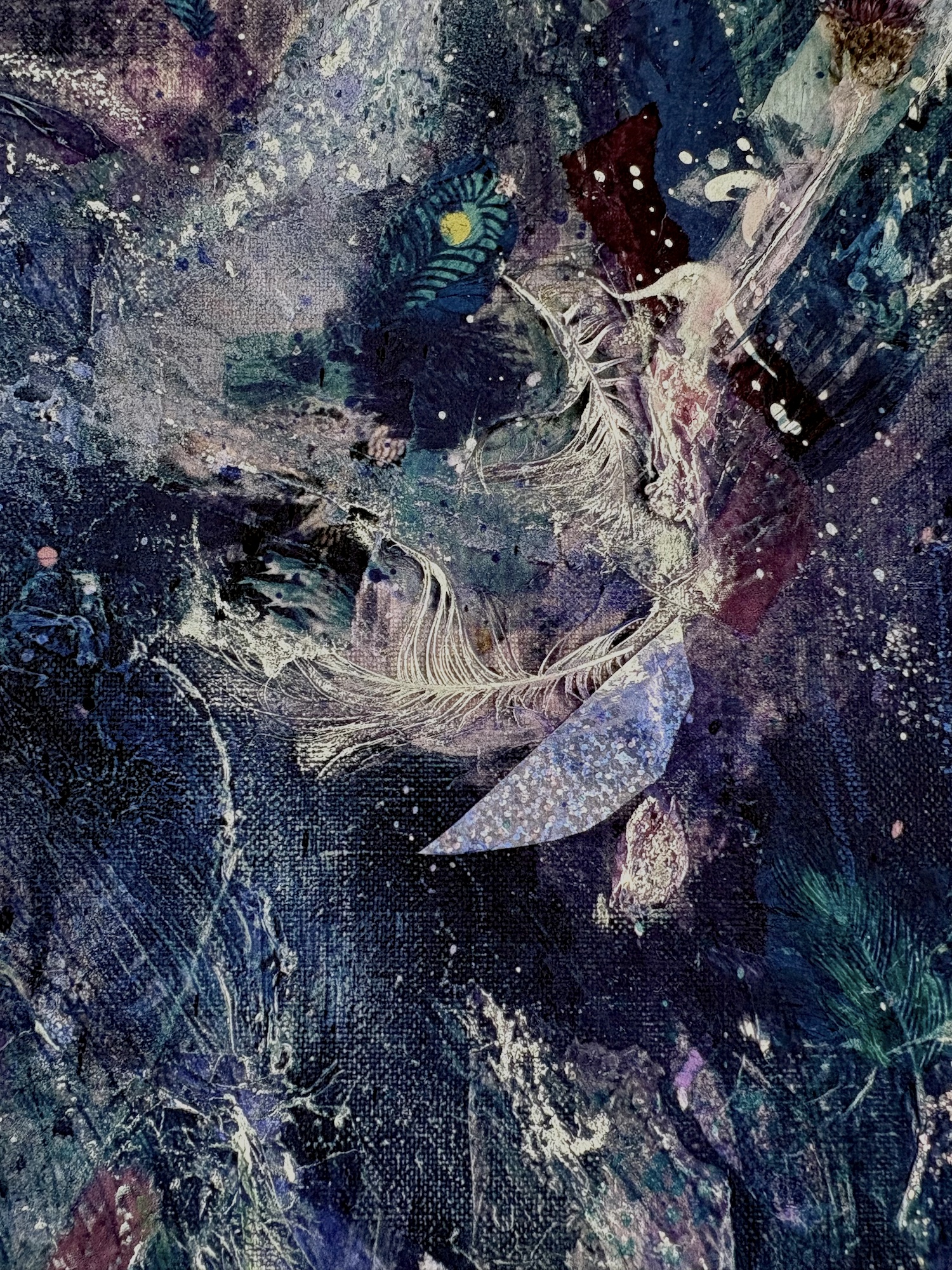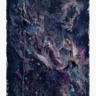The Greek deity Hera – (long-suffering wife of Zeus) seems to have a multitude of goddess responsibilities, but she’s also associated with the air, so I have created this first work around her. A powerful queen calling her own wildness in, and exhaling moonlit magic into an inky night sky.