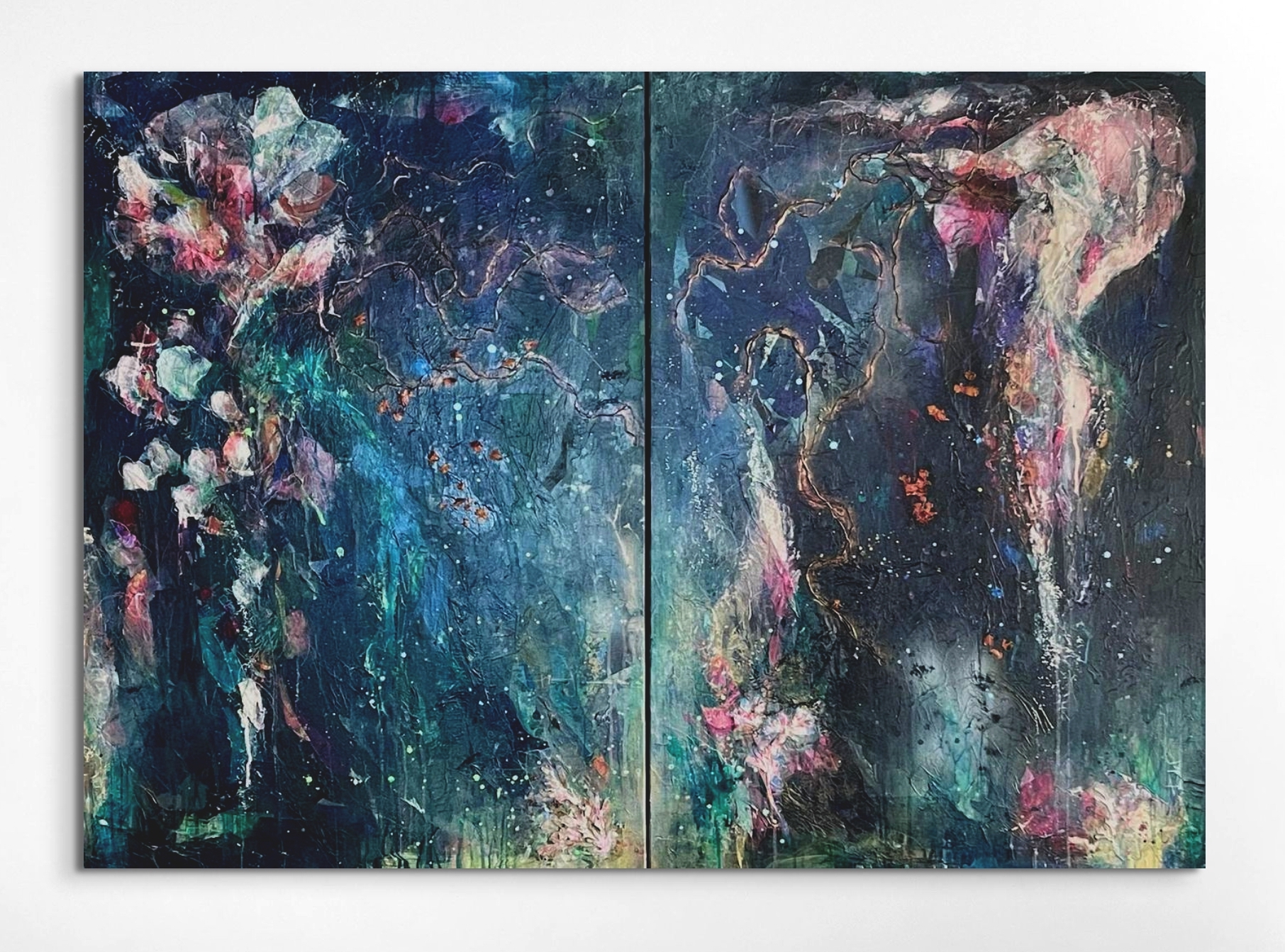Organic shapes emerge from a primal natural darkness – a lush forest at night, or deep under the sea. A safe primal in-between (liminal) space where we can be the soft natural beings we are, and rest a while with Mother Nature.