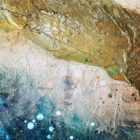 Mixed media including recycled collage, wax, acrylic paint, ink, and metallic mediums on canvas. Unframed.